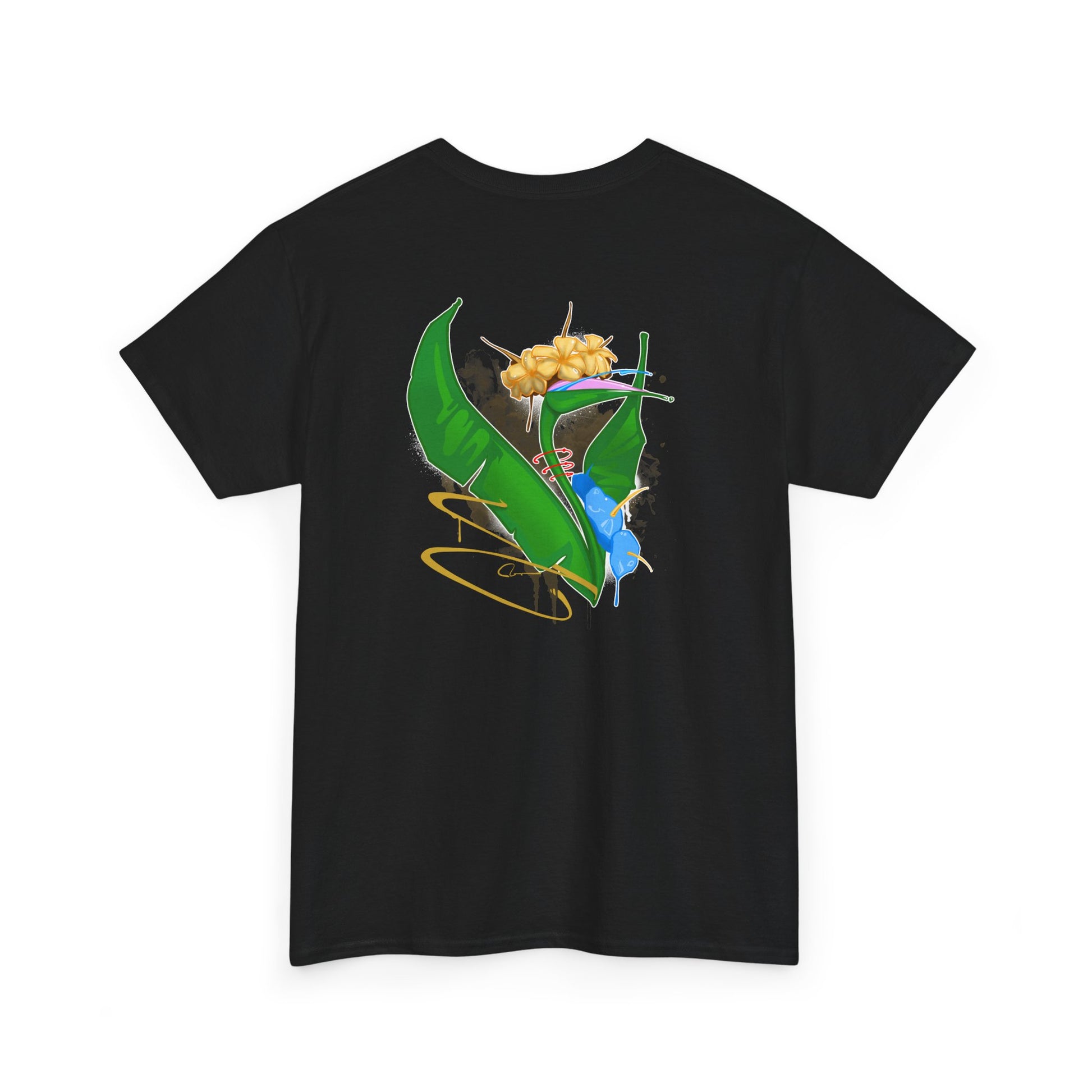 Introducing the Lei Po'o T-Shirt. The famous RFA Bird Of Paradise gracefully dawning a yellow Plumeria Lei Po'o is a reminder to welcome each day with open arms.